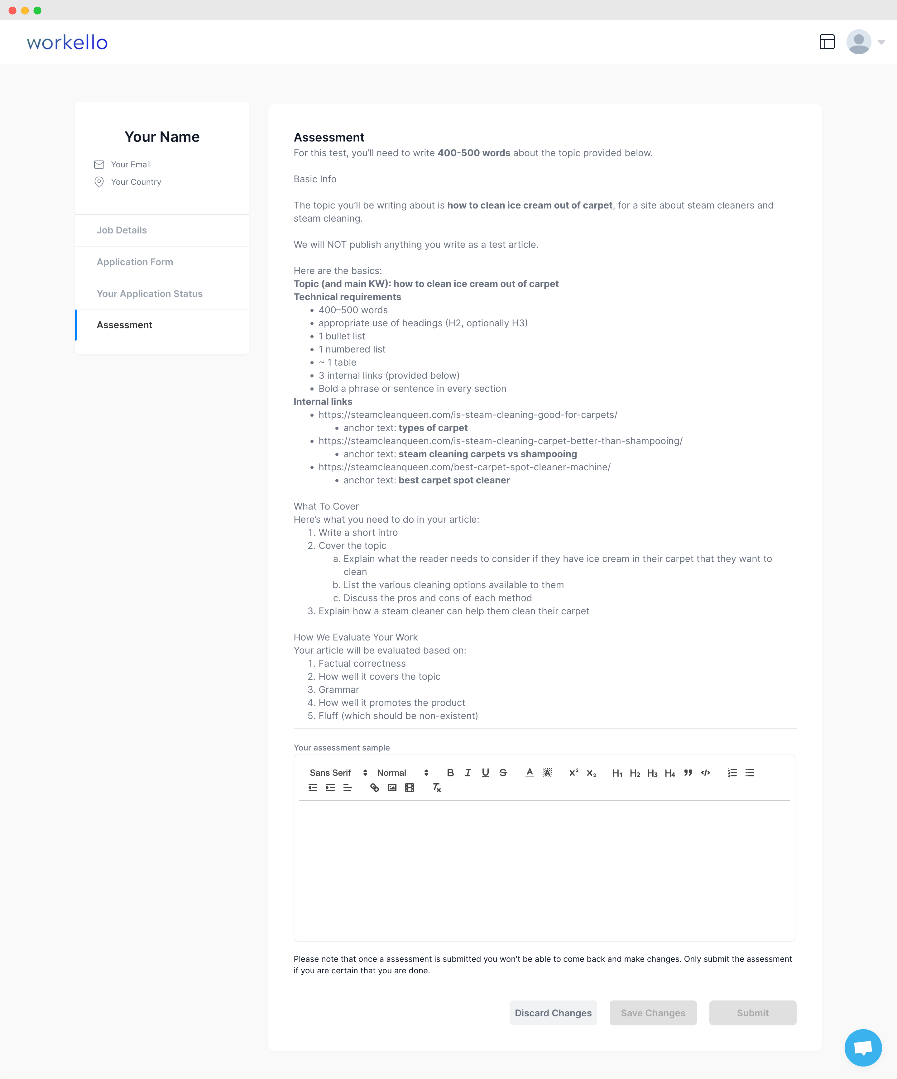 The assessment task they chose was also based on Workello’s pre-optimized template and aligned with their brand and the type of content they want to produce. Workello’s writing assessment was designed to be: